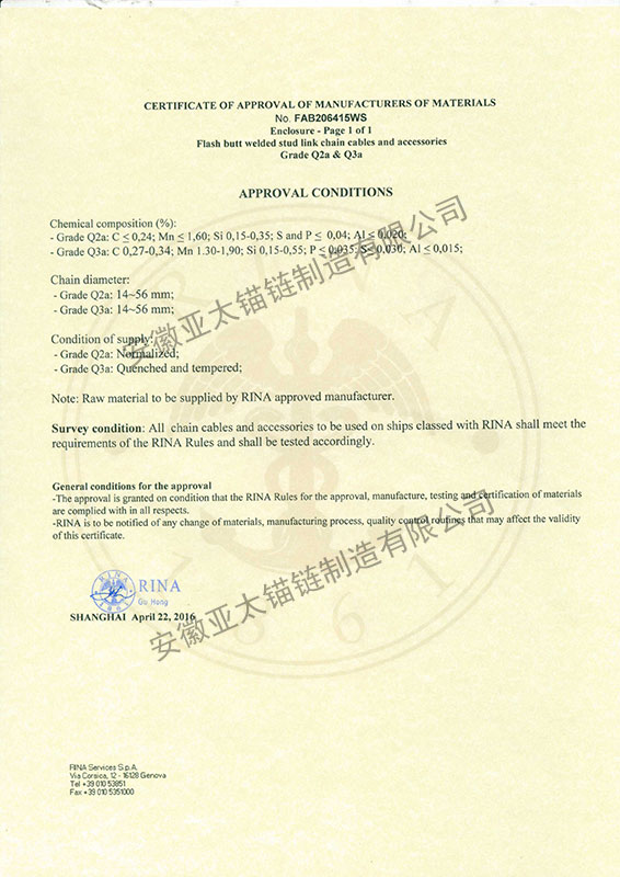 安徽亞太錨鏈制造有限公司是國家高新技術(shù)企業(yè),也是國家GB/T 549-2017《電焊錨鏈》標準的起草和制定單位之一。公司旗下設(shè)有錨鏈分廠、浮標分廠、舾裝件分廠等多個分廠。公司專業(yè)從事φ12.5mm-φ107mm二、三級船用錨鏈、浮標錨鏈、錨鏈附件,錨、船舶曬裝產(chǎn)品、航標、系船浮、船型標、多種規(guī)格海洋監(jiān)測浮標及航標燈等產(chǎn)品的生產(chǎn)、安裝和服務(wù)。目前公司的產(chǎn)品銷往全國各地船廠、碼頭、航標處、航道局、海洋局,并已走上國際市場,如東南亞、中東、歐美等國家。